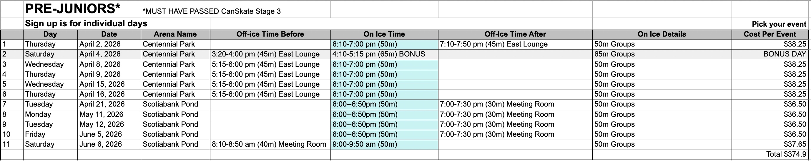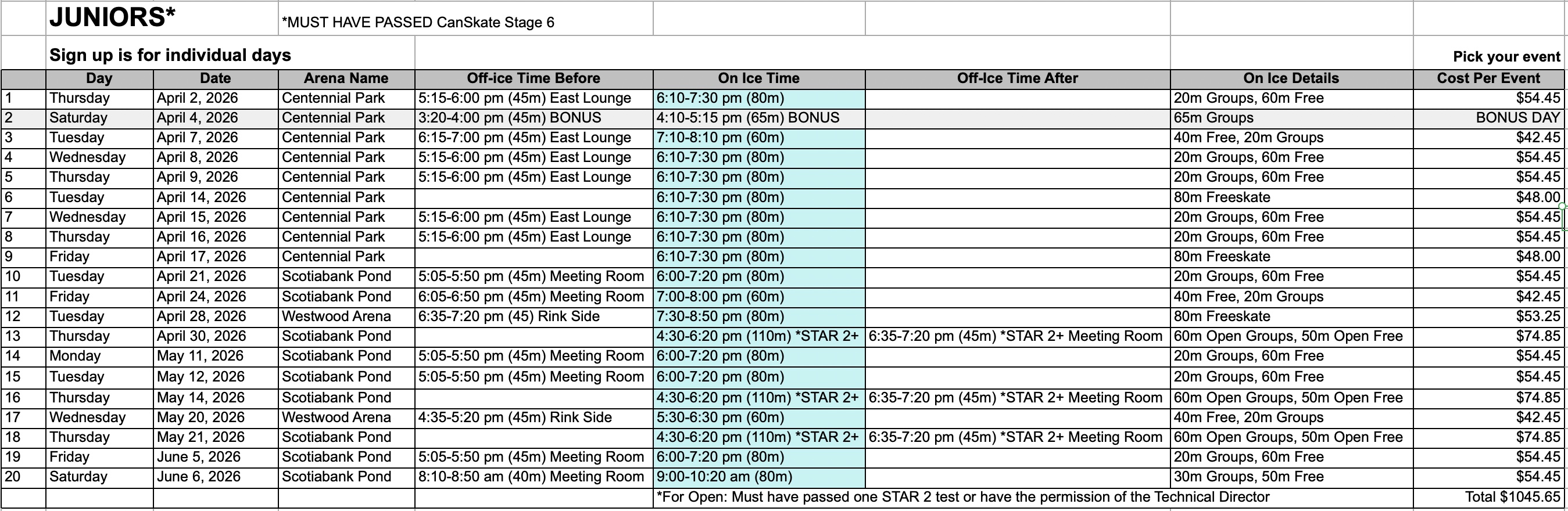 - Spring Session is for skaters in Pre-Junior and higher only, with the exception of the April 4th Bonus Skating Day.